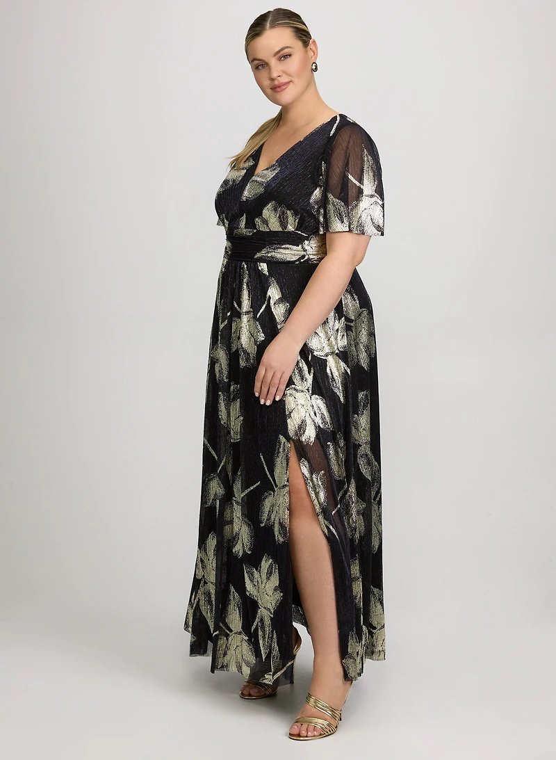 Notre robe signée Joseph Ribkoff est parfaite pour les moments spéciaux qui exigent un look élégant tout en restant ludique. Associez-la à des bijoux délicats et à une pochette épurée pour sublimer la tenue.Fait au CanadaEncolure en V Détails en fil métallique et motif floralPlissée Détails plissés à la taille DoubléeLongueur à partir de l'épaule : 58 po