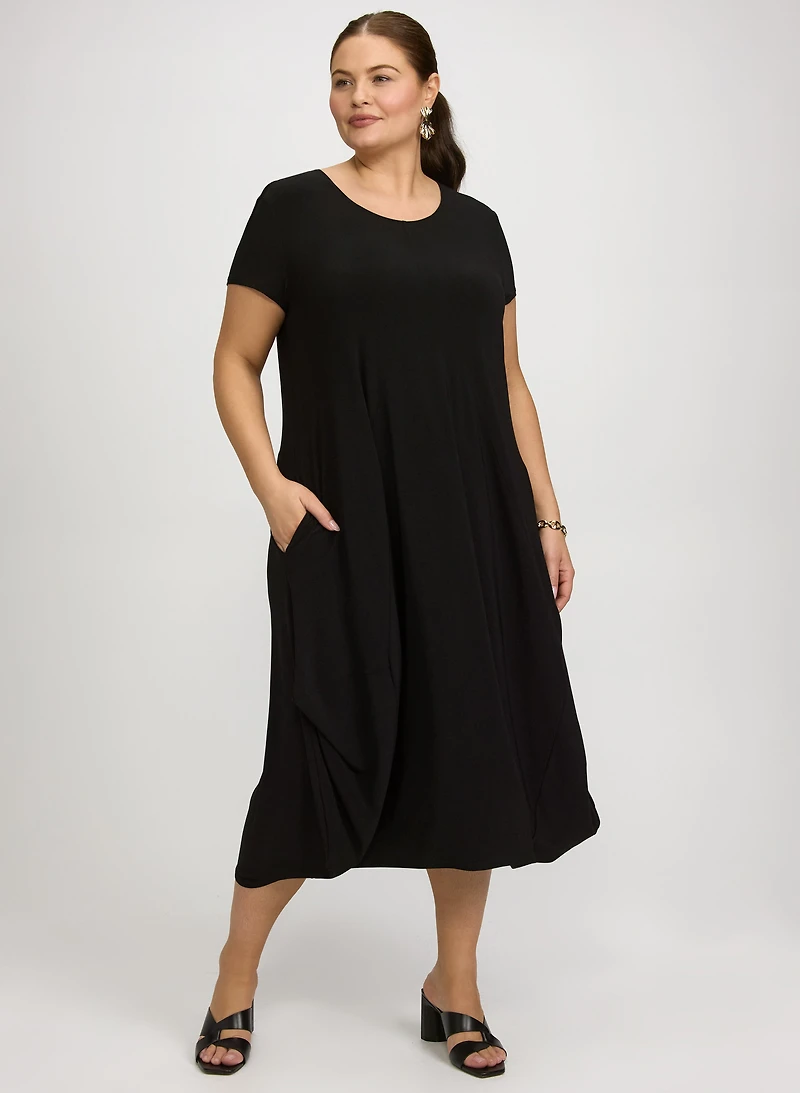 Enfilez notre robe notre classique ultra élégante et confortable signée Joseph Ribkoff. Portez-la avec des accessoires audacieux pour une tenue décontractée et féminine.Fait au CanadaEncolure dégagéeManches courtesPoches cavalièresMatière en tricot soyeuxLongueur à partir de l'épaule : 45 po