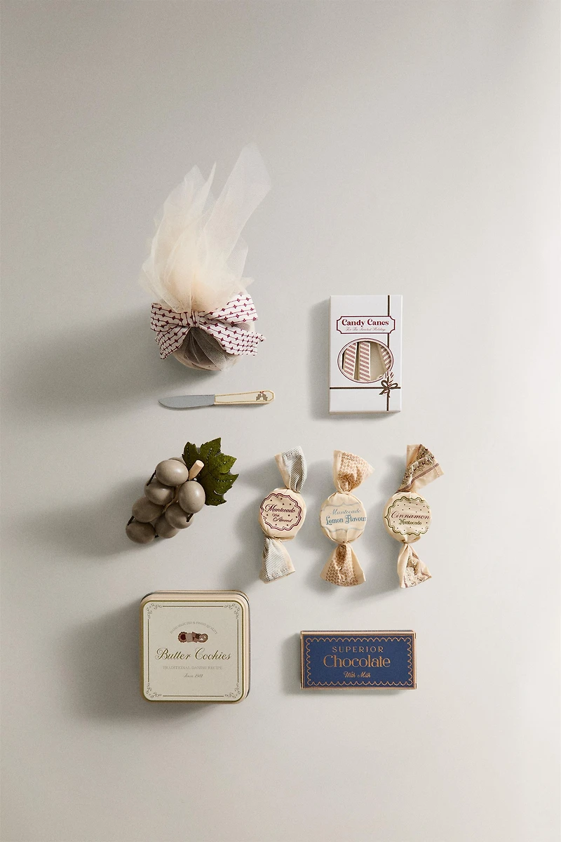 Comprend 9 pièces : boîte de biscuits, panettone, tablette de chocolat, grappe de raisin, boîte de bâtons de sucre d’orge, assortiment de biscuits de Noël et couverts.