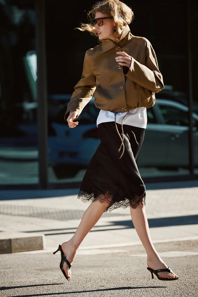Jupe à mi-mollet en tissu légèrement satiné. Modèle avec élastique dissimulé à la taille et bas droit terminée par bord festonné en dentelle. Non doublée.