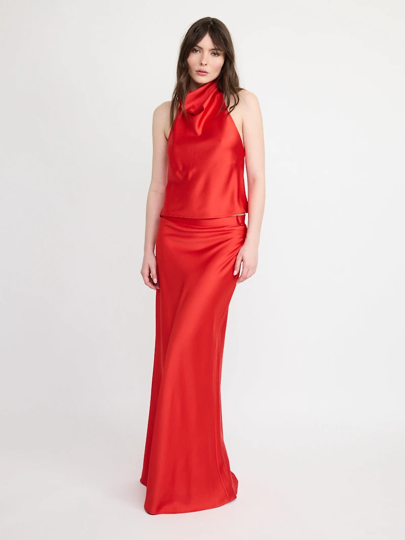 Elegant midi skirt featuring a fluid A-line silhouette that moves beautifully with every step. Designed with a high-rise waist and finished with a slim belt and gold-tone buckle for a refined touch. A timeless piece that pairs effortlessly with blouses, knits, or tailored tops for both day and evening looks.