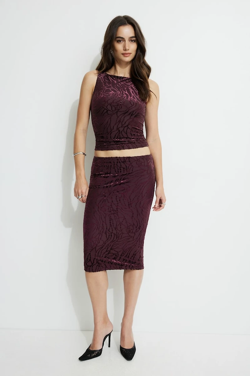 Cette jupe midi à effet usé est conçue pour avoir une silhouette ajustée.