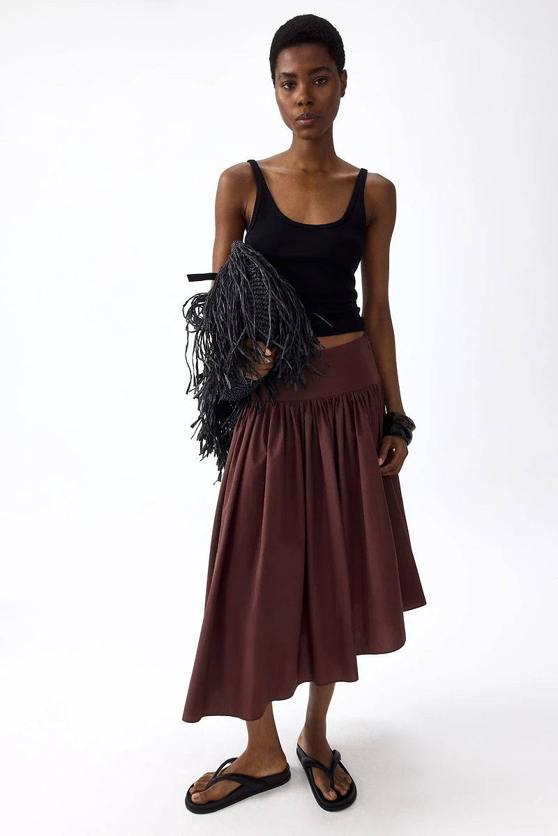 Jupe à mi-mollet en tissu craquant de coton et nylon mélangés. Modèle taille haute avec ceinture double épaisseur munie d'une fermeture éclair dissimulée sur un côté et soulignée de fronces pour plus d'ampleur. Bas asymétrique. Non doublée.