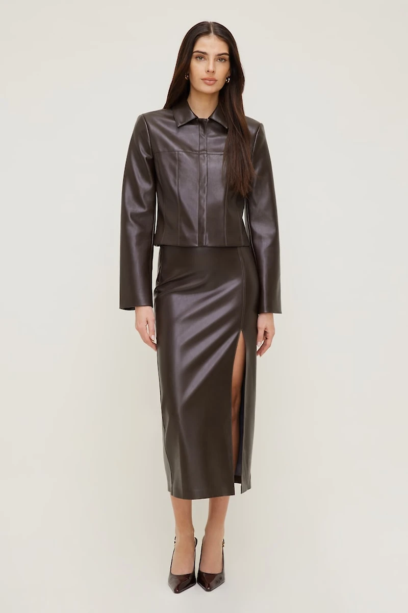 Cette jupe est faite en faux cuir extensible pour une sensation douce et sensuelle. Elle repose à la taille et est ajustée sur toute la longueur, ce qui vous donne un style raffiné. Portez-la avec votre