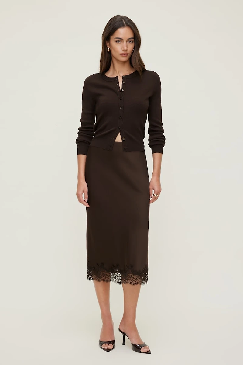 Cette jupe en satin soyeux avec un soupçon d'extensibilité offre un drapé fluide et sans effort qui suit tous vos mouvements. Elle est conçue pour reposer à votre taille de manière décontractée, et sa bordure en dentelle lui confère une touche sensuelle. Agencez-la à une