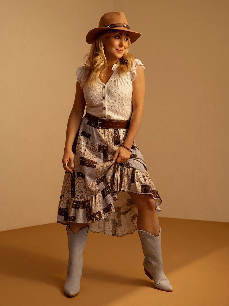 Jupe midi composée de panneaux assemblés en motif style patchwork, avec une taille élastiquée agrémentée de fronces tout autour de la ceinture. Elle présente une coupe évasée, sublimée par un volant rapporté en bas, et se distingue par ses motifs variés, mêlant imprimés floraux et géométriques.