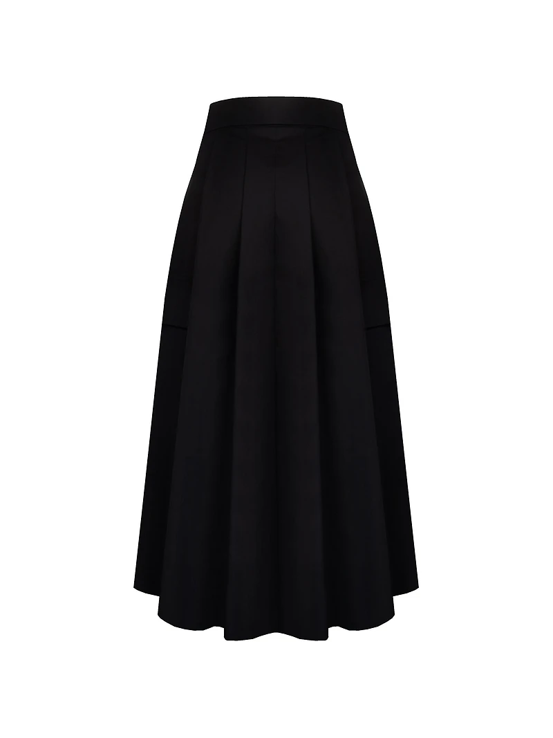La jupe midi ample allie une élégance intemporelle à une silhouette moderne. Sa taille haute crée une coupe définie et flatteuse qui allonge la silhouette, tandis que sa coupe trapèze volumineuse offre une grande aisance de mouvement. Confectionnée dans un tissu structuré, cette pièce conserve magnifiquement sa forme pour un aspect net et sculpté.