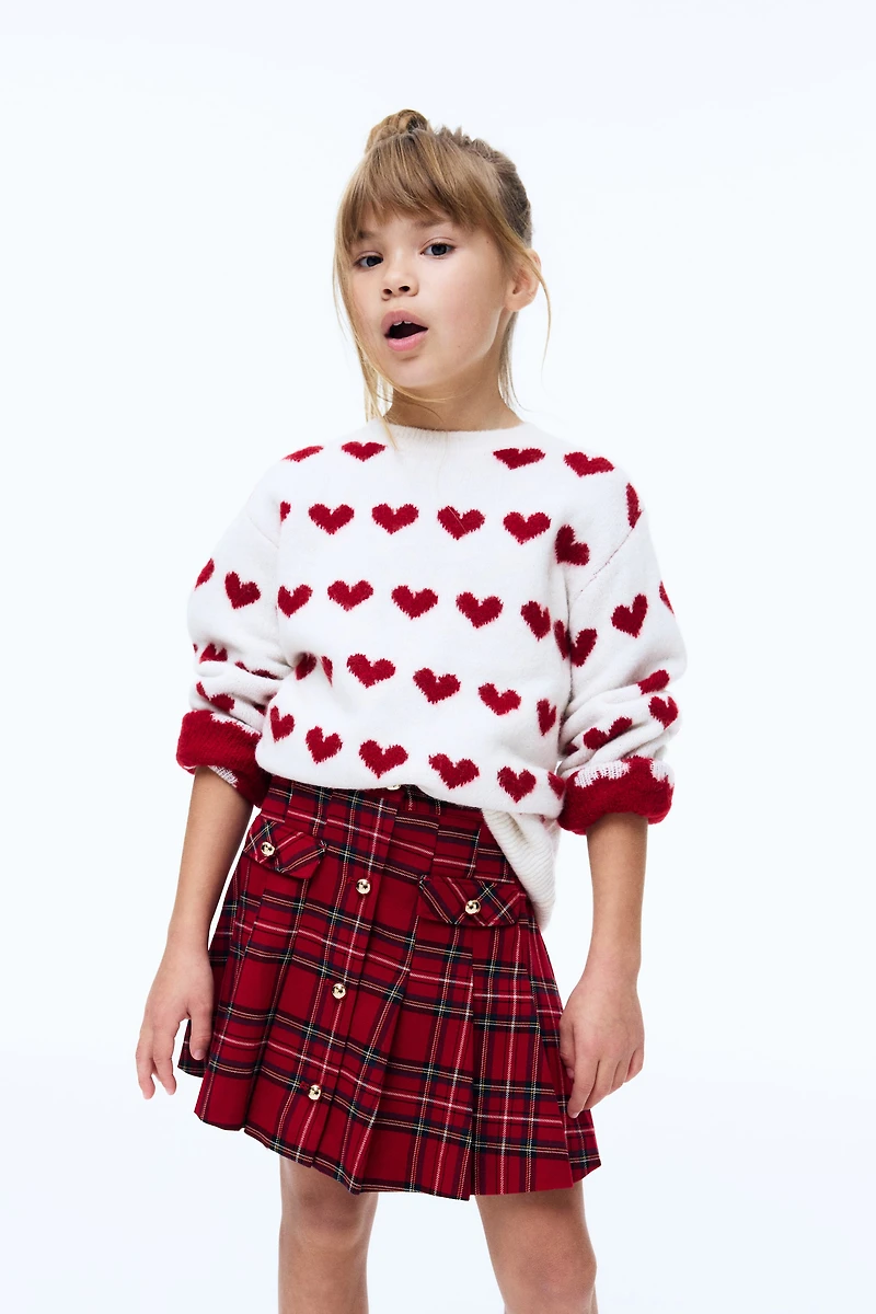 Jupe trapèze en flanelle douce avec pinces devant. Modèle avec élastique réglable à la taille et boutons en métal en forme de cœur devant et sur les rabats de poche.