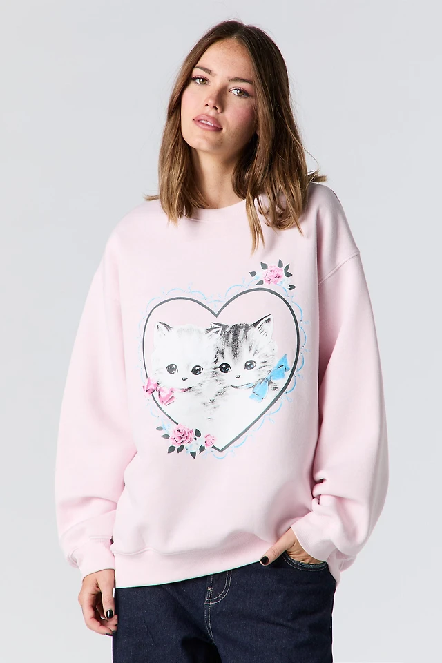 Kitten Graphic Rhinestone Fleece Sweatshirt