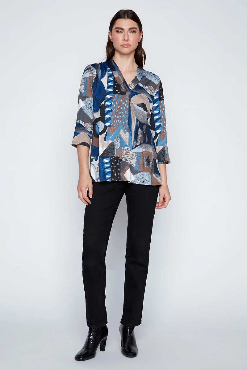 Ce haut à imprimé abstrait présente une encolure en V flatteuse et des manches 3/4 élégantes. Confectionné en maille douce, il offre un confort optimal tout au long de la journée. Fièrement fabriqué au Canada et disponible en exclusivité chez Cazza Petite & Zacks, ce haut apporte une touche unique et dynamique à votre garde-robe.