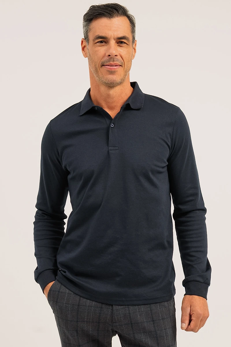 Le polo marine à manches longues présente une coupe semi-ajustée avec une encolure polo à deux boutons. Ses manches longues et son tissu extensible offrent un confort agréable et une allure décontractée mais soignée.