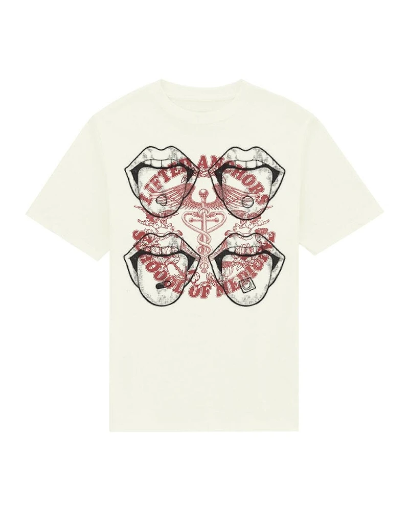 T-shirt oversize à l'avant-garde avec sérigraphie détaillée mettant en vedette quatre bouches stylisées entourant un caducée central, symbole médical revisité avec texte intégré. Le dos affiche le logo WLKN en texture grunge distressée. Coupe confortable et intemporelle en coton-polyester.