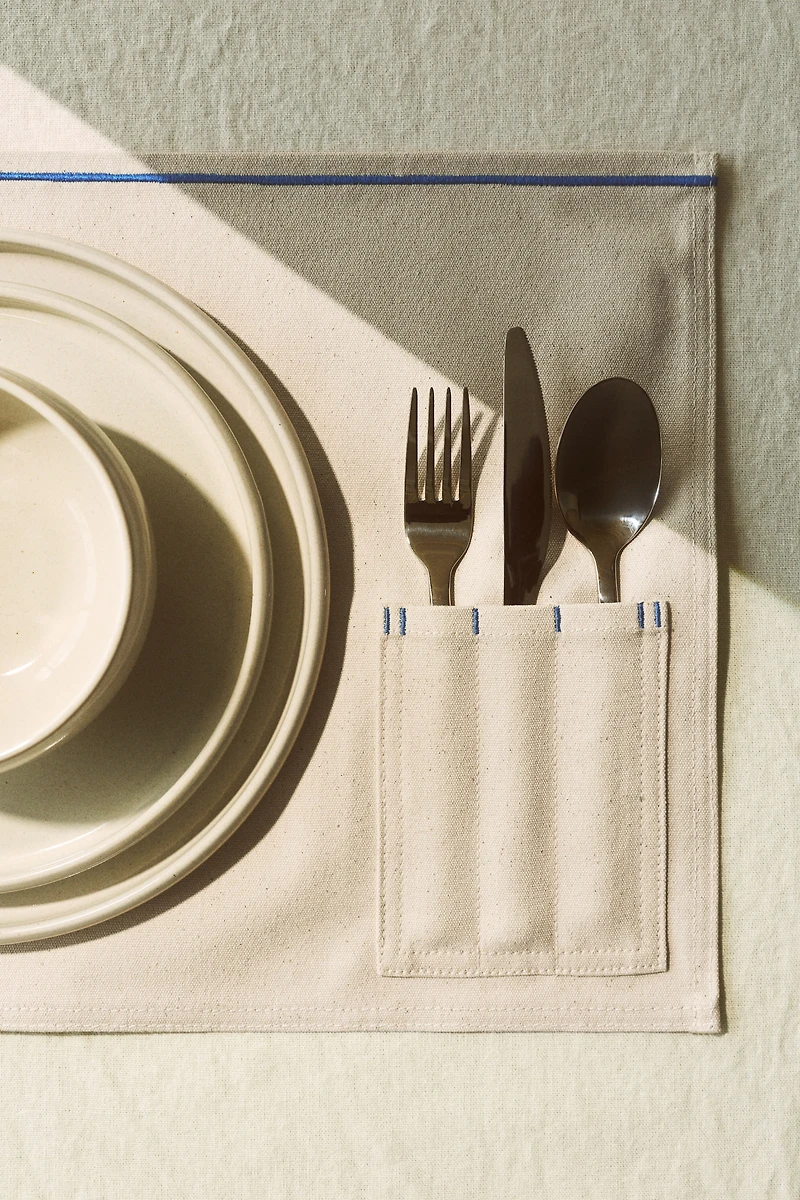 Napperons en toile de coton de bonne tenue avec détails contrastants au point de satin. Modèle avec poche à couverts pratique.