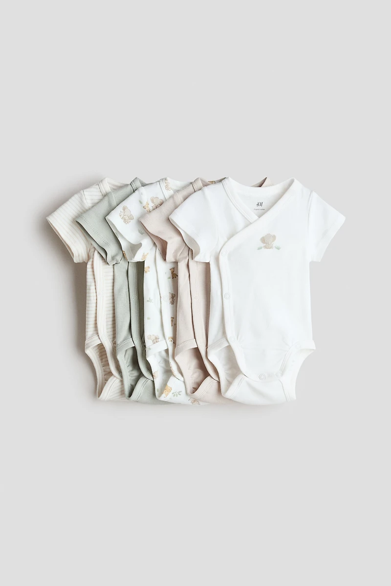 Maillots à manches courtes en jersey de coton doux. Modèle à fermeture croisée avec boutons-pression sur les côtés et à l'entrejambe.