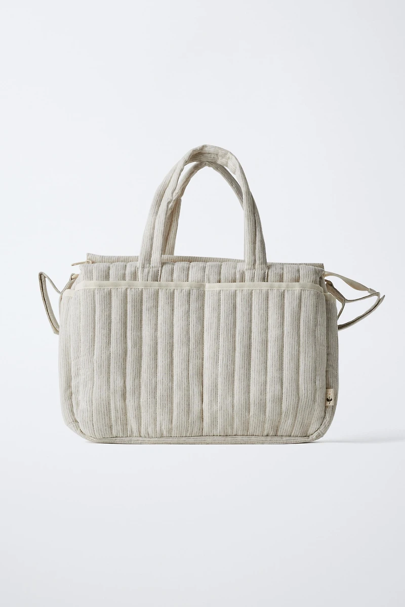 Lot de sac à langer imprimé à rayures. Trousse de toilette et matelas à langer assortis. Détail intérieur imprimé d'étoiles. Sac à rayures : compartiment principal avec fermeture zippée. Deux poches avant et deux poches latérales. Avec deux brides auto-agrippantes pour la fixation sur le chariot. Double poignée. Trousse de toilette à rayures : fermeture zippée. Matelas à langer à rayures : fermeture par bride auto-agrippante. Ce lot est indivisible, il sera retourné complet.