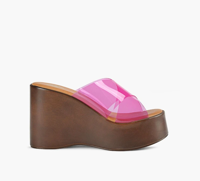 La sandale Madison compensée de B2 Madison propose une interprétation audacieuse de la sandale estivale. Montée sur une plateforme sculpturale, cette mule à enfiler se distingue par sa tige translucide au fini brillant. Pensée pour rehausser les tenues du quotidien, elle apporte une touche mode forte, du denim aux robes légères.