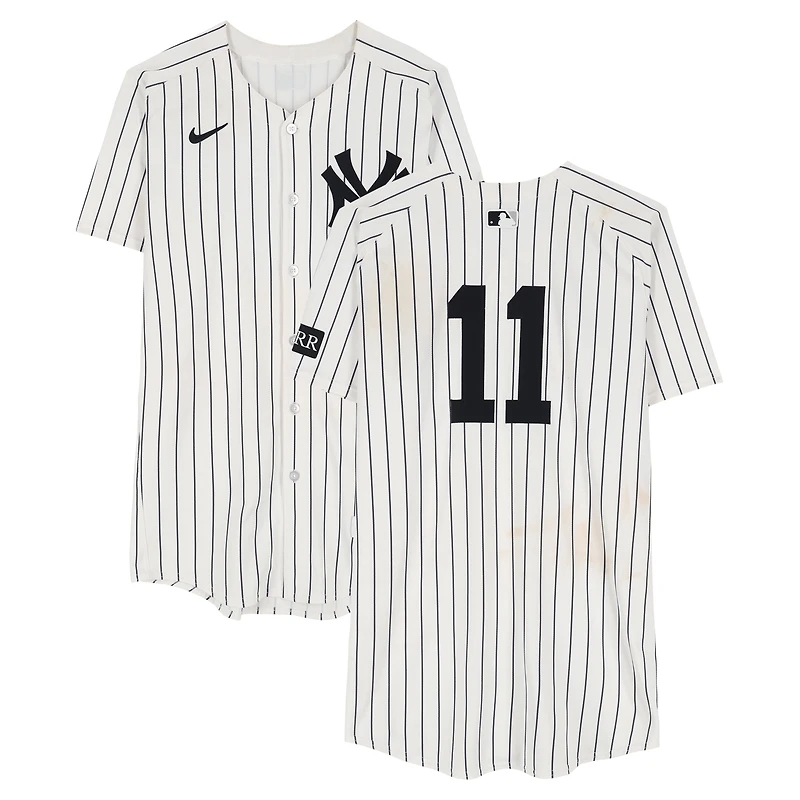 Enrichissez votre collection de souvenirs des Yankees de New York avec ce maillot Nike blanc à fines rayures n° 11 d'Anthony Volpe, porté lors du match. Fabriqué selon les spécifications du joueur et présentant des détails authentiques, il a été porté lors du match de son équipe contre les Orioles de Baltimore le 28 septembre 2025. Obtenu sous les auspices de la Ligue majeure de baseball, ce maillot est accompagné d'un hologramme numéroté et inviolable, vérifiable en ligne, pour certifier son authenticité.