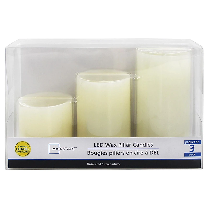 Les mini bougies piliers en cire à DEL de Mainstays sont vendues en lot de 3 dans différentes tailles (5 cm diam. X 5 cm H, 5 cm diam. X 7,6 cm H, 5 cm diam. X 10 cm H). Illuminez les jours avec la chaude lueur ambrée vacillante de cette bougie pilier à DEL sans flamme en cire véritable, sans danger pour toute la famille, y compris les enfants et animaux domestiques. Cet ensemble constituera un merveilleux cadeau pour votre famille et vos amis ou sera idéal pour décorer votre maison. Chaque bougie à DEL utilise 1 pile CR2032 (comprise).Cette bougie pilier en cire à DEL de Mainstays Mainstays se déclinent en plusieurs tailles et en différentes formes, soit des lumignons, droites, votives, flottantes et piliers. Cette bougie peut être utilisée seule ou avec les autres styles de la même collection pour créer un arrangement de bougies n’importe où.