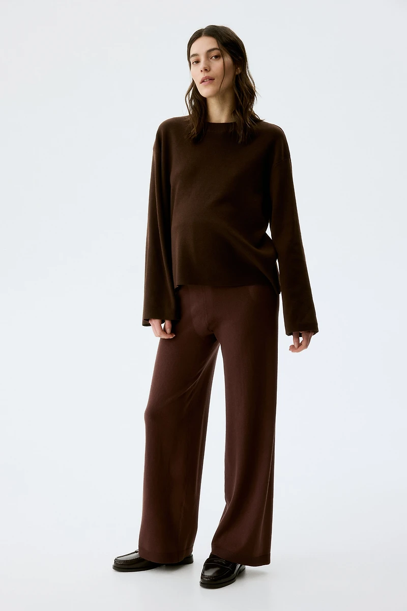 Pantalon en maille de viscose mélangée. Modèle avec taille haute soulignée par ourlet côtelé. Jambes longues et amples, terminées par ourlet côtelé.