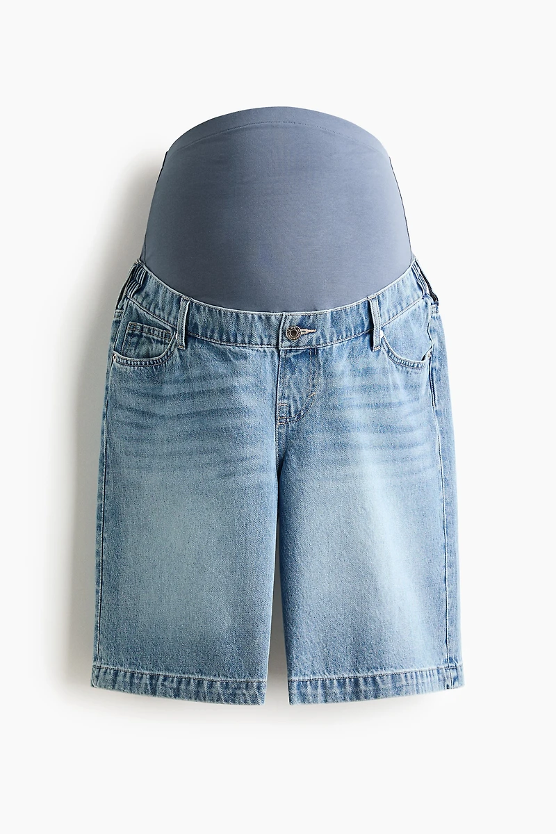 Bermuda 5 poches au genou en denim de coton. Modèle avec large bande de jersey à la taille pour un meilleur ajustement au niveau du ventre et élastique habillé de chaque côté.