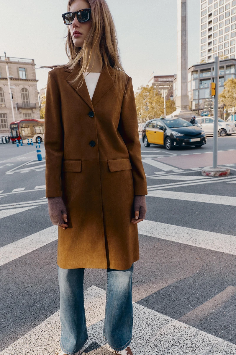 Veste longue type manteau confectionnée en tissu effet daim. Col à revers crantés et manches longues. Poches à rabat sur le devant. Bas droit. Fermeture boutonnée sur le devant.