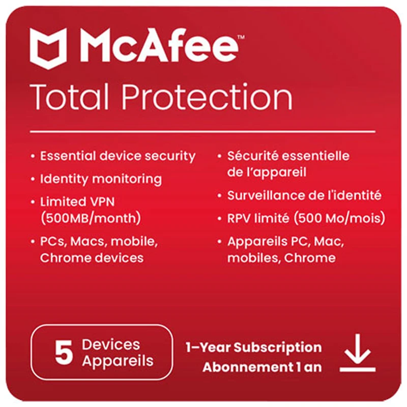 McAfee Total Protection (PC/Mac/Android/iOS) - 5 appareils - 1 an - Téléchargement numérique