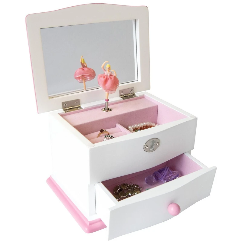 Cette charmante boîte à bijoux ballerine musicale en bois de Mele and Co est une version moderne d'un classique de l'enfance. Le couvercle relevable miroir ouvert permet à votre tout-petit d'accessoires et de se coordonner au fur et à mesure qu'il se prépare pour sa journée. Une fois ouverte, une figurine de ballerine fantaisiste virevolte gracieusement sur l'air de "Magic Flute". Le tiroir unique offre un espace de rangement supplémentaire pour toutes leurs pièces précieuses. Extérieur blanc avec garniture rose et intérieur en suède rose.