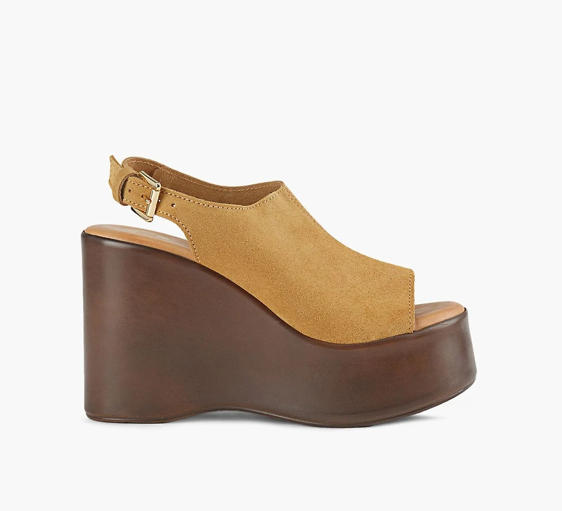 Le modèle Melrose de B2 est une sandale compensée au design affirmé et à la silhouette contemporaine. Dotée d’une empeigne à bout ouvert et d’une bride arrière munie d’une boucle, elle repose sur une semelle plateforme sculptée qui apporte de la hauteur tout en conservant un bel équilibre visuel. Le contraste entre la ligne épurée du dessus et la semelle imposante en fait une option élégante, idéale du jour au soir.