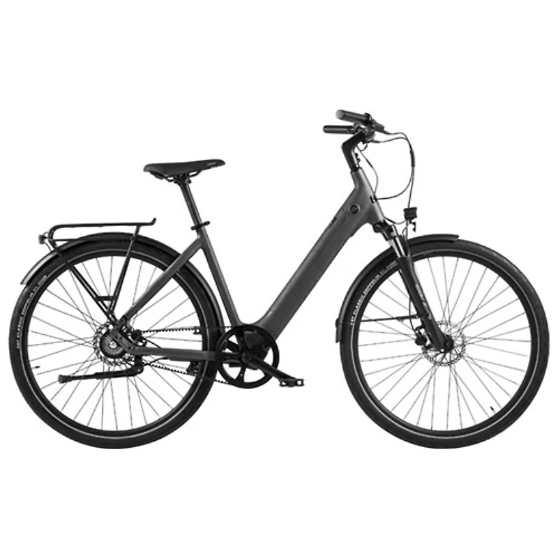 Seven speeds and throttle assist is perfect for urban commutes 500W hub motor delivers reliable performance with speeds of up to 32km/h (20mph) 48V/13Ah rechargeable lithium battery delivers 50km to 55km of range per charge and recharges completely in only three hours 26" x 2.125" fat air tires deliver dependable traction across varied terrain Durable aluminum alloy step-through frame ensures lasting strength and reliability Low step frame design makes mounting and dismounting effortless for any rider Front suspension absorbs bumps for smooth, comfortable rides Equipped with front and rear disc brakes for consistent stopping performance Convenient rear rack makes storage effortless and kickstand ensure easy parking Maximum weight capacity: 113.4 kg (250lb.) Assembly required