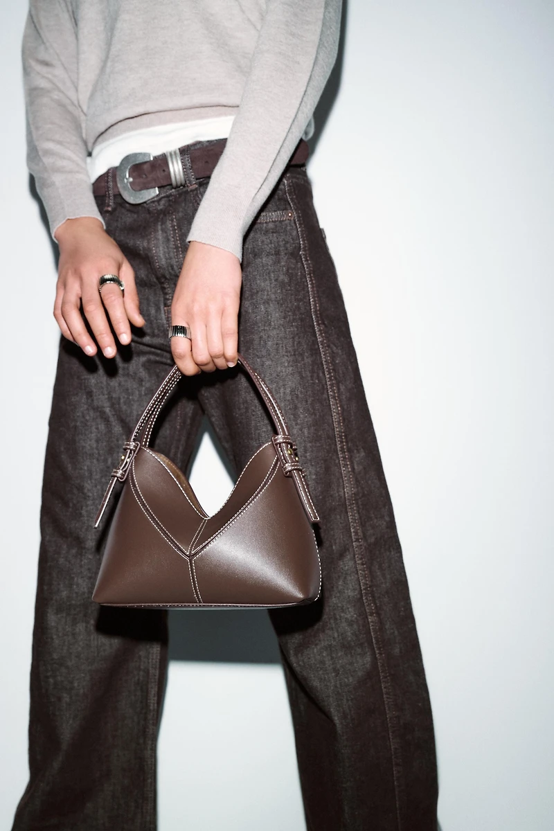 Sac forme mini seau. Anse et anse bandoulière amovible. Détail de surpiqûres en contraste. Portefeuille intérieur amovible avec fermeture éclair.