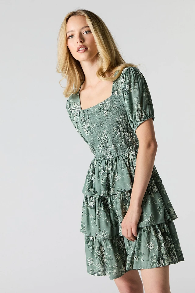 Minirobe à volant, ruché et manche bouffante imprimé floral