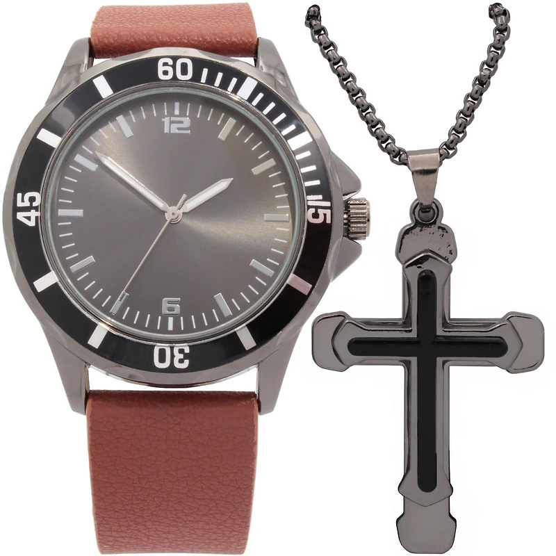 Montre analogique facile à lire pour homme avec bracelet en similicuir PU brun et collier avec croix de métal bronze