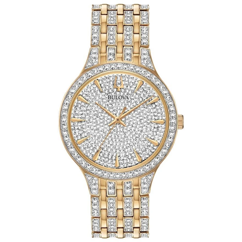 Nouveau style mince et élégant décoré de 636 cristaux. Modèle montré avec un boîtier et un bracelet en acier inoxydable aux teintes or. Cette montre comprend un cristal minéral, un mouvement à quartz et une hydrorésistance de 30 mètres.