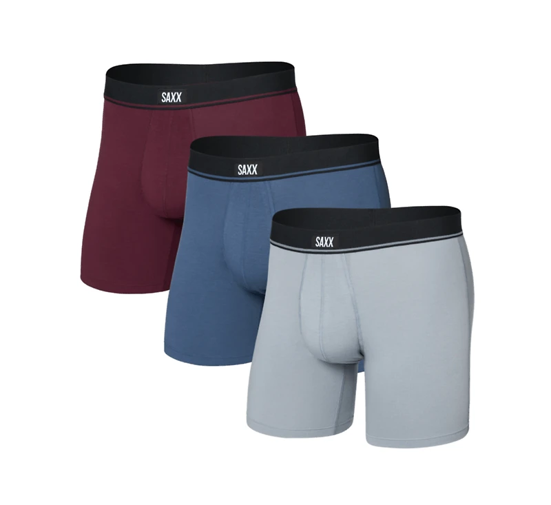 Pack de 3 boxers  Caractéristiques : Jersey composé d’un mélange de coton et de modal extensible Coupe ajustée Ouverture à l'avant Bande élastique à la taille Poche frontale 3D BallPark Pouch™ en micro-mesh qui prévient la friction peau contre peau Conçu au Canada Trois boxers par paquet Longueur de l'entrejambe : 6 po Matériaux + Entretien 57% cotton 38% modal 5% spandex Instructions d'entretien :Lavage en machine à froidCycle délicatUtiliser uniquement de l'eau de Javel sans chlore si nécessaireSéchage en machine à basse températureRepasser à basse température *Les délais de livraison pour les produits Saxx peuvent varier entre 5 et 10 jours ouvrables.