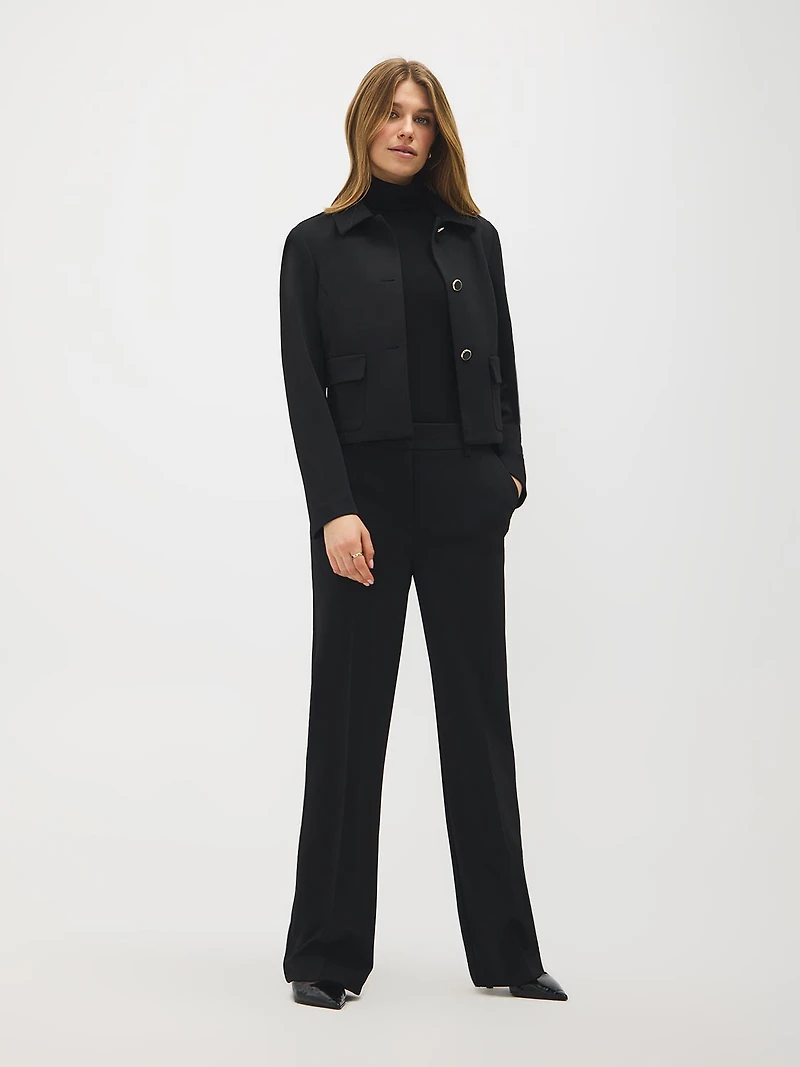Ce pantalon à jambe large en sergé allie élégance et fluidité alors qu'il vient allonger la silhouette. Sa coupe ajustée le rend polyvalent, idéal pour le travail comme pour les sorties en soirée. Il s'accorde parfaitement avec le blazer assorti pour un look soigné de la tête aux pieds.