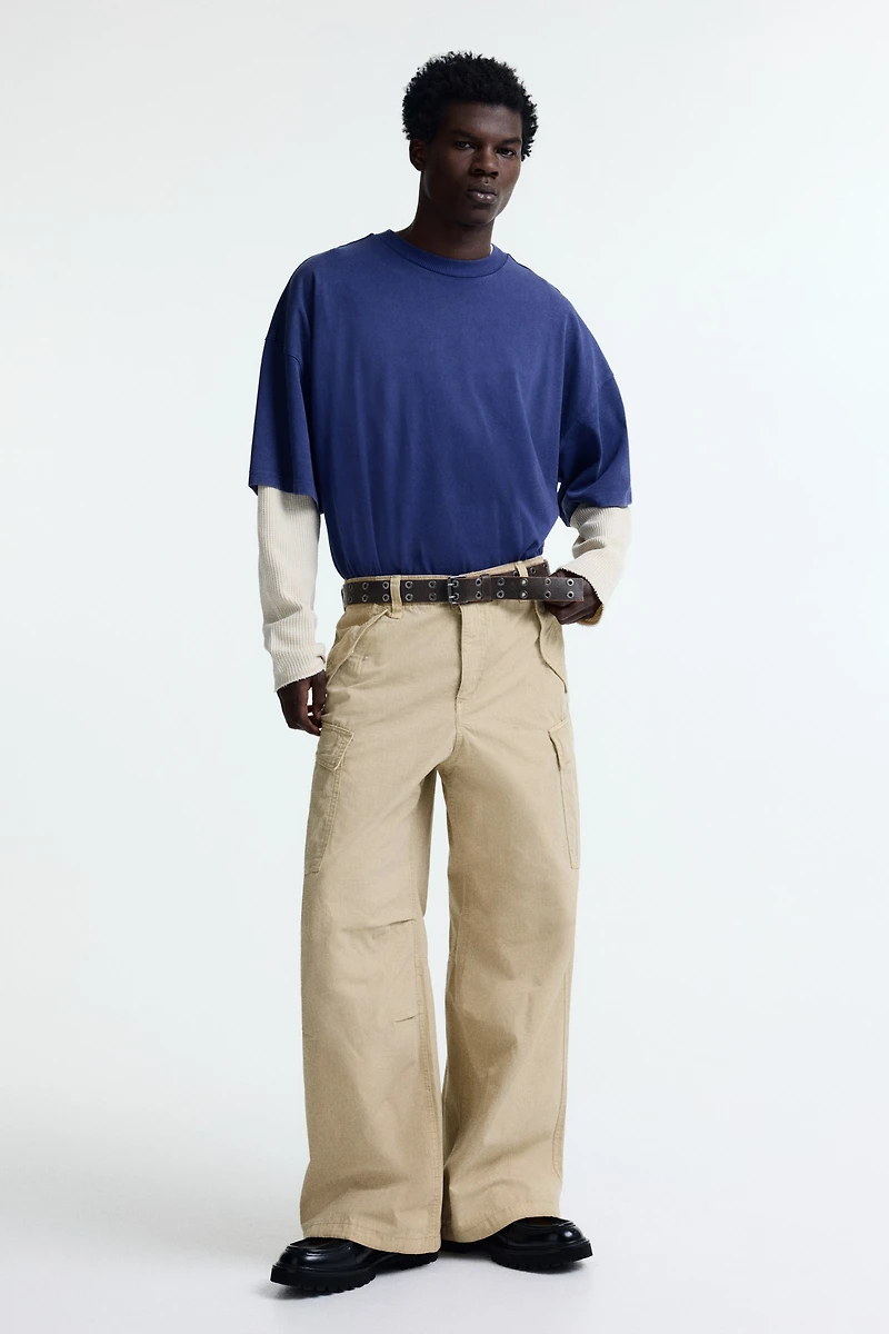 Pantalon cargo en matière tissée. Modèle avec cordon de serrage à l'intérieur de la ceinture et braguette à fermeture éclair surmontée d'un bouton. Poches latérales à rabat, poches à rabat sur les jambes et poches à rabat auto-agrippant derrière. Plis piqués au niveau des genoux et cordon de serrage dissimulé en bas de jambe. Coupe ample qui offre de l'aisance sans être trop grande.