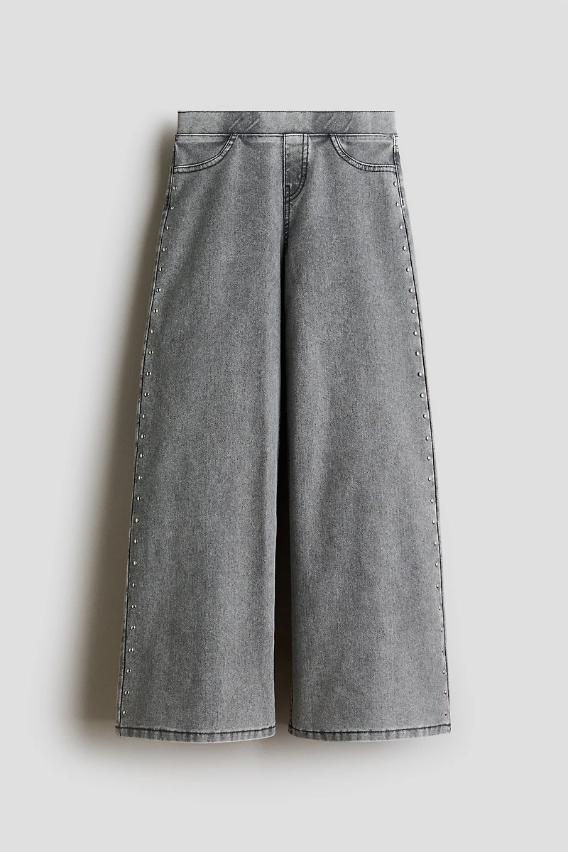 Pantalon en jersey épais à l'aspect denim. Modèle avec élastique à la taille et fausse braguette. Poches décoratives devant et vraies poches dans le dos. Jambes larges avec finition cloutée sur les côtés.