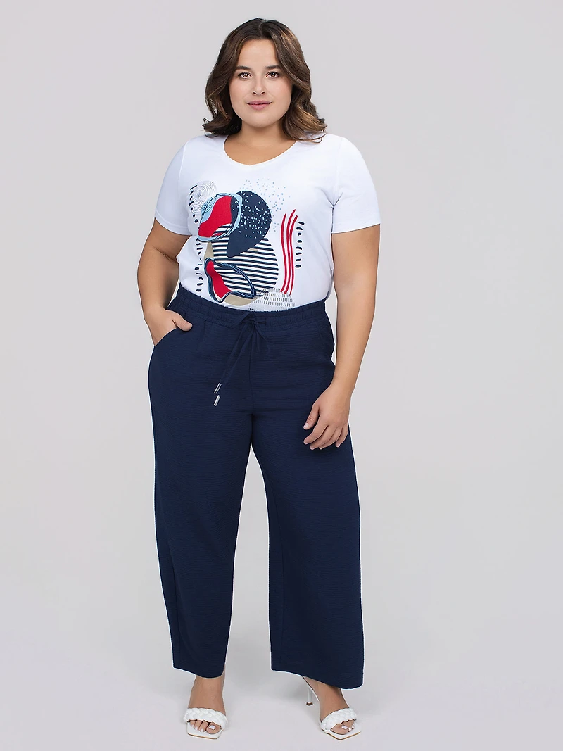 Pantalon uni décontracté avec taille élastiquée et cordon de serrage à l’avant. Il présente une coupe droite ample, des poches latérales intégrées et une longueur cheville.