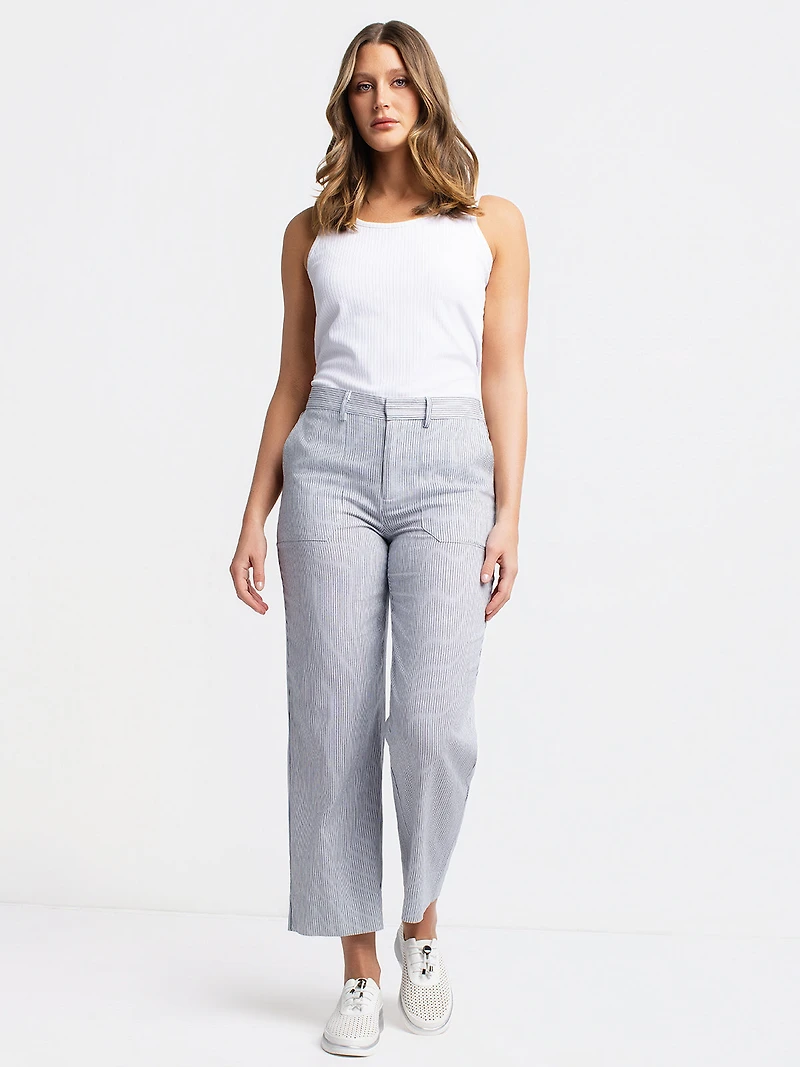 Pantalon à coupe droite avec ceinture à passants et poches latérales. Le modèle présente de grandes poches latérales à l’avant. La surface textile est ornée de fines rayures verticales réparties sur l’ensemble.