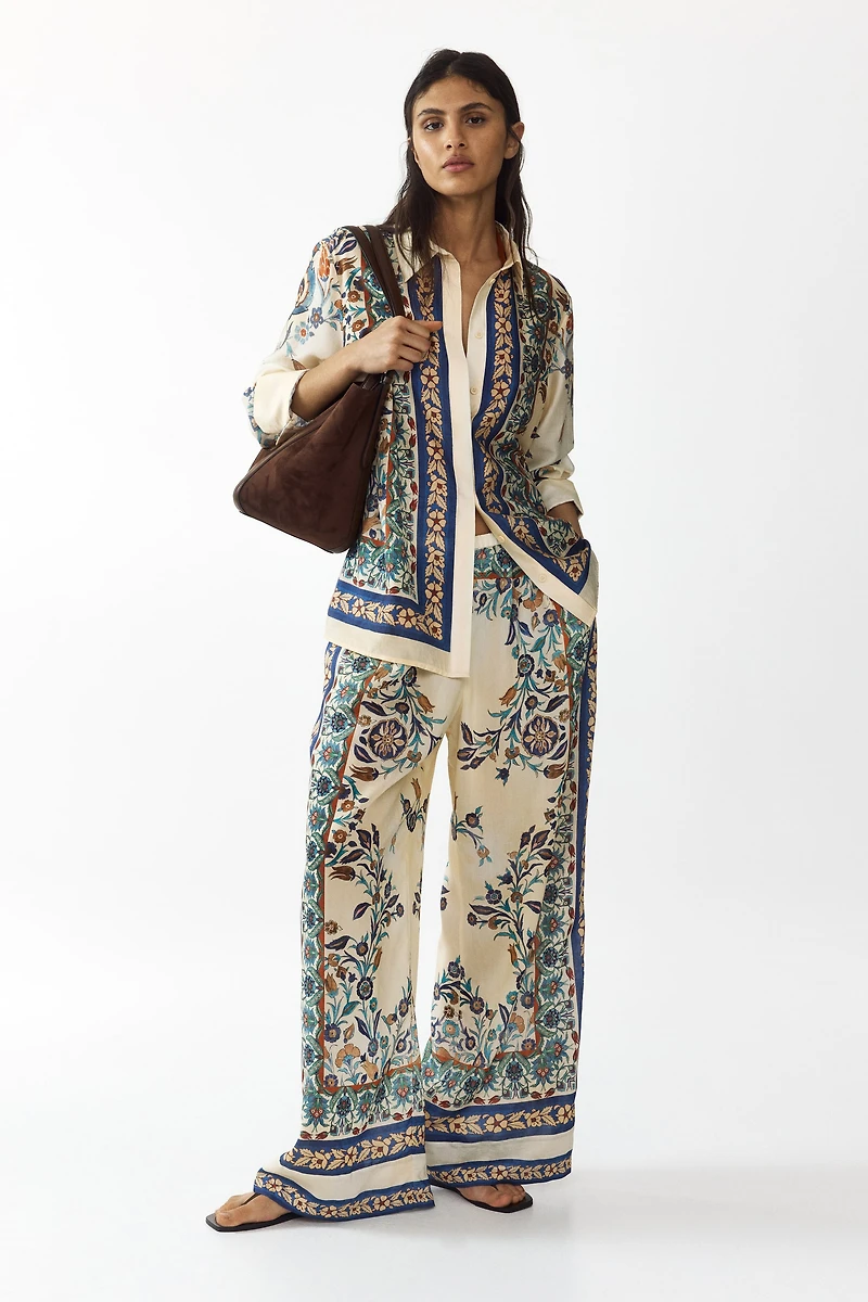 Pantalon imprimé en tissu de viscose mélangée. Coupe flottante avec taille haute soulignée par élastique habillé. Poches latérales discrètes. Jambes larges.