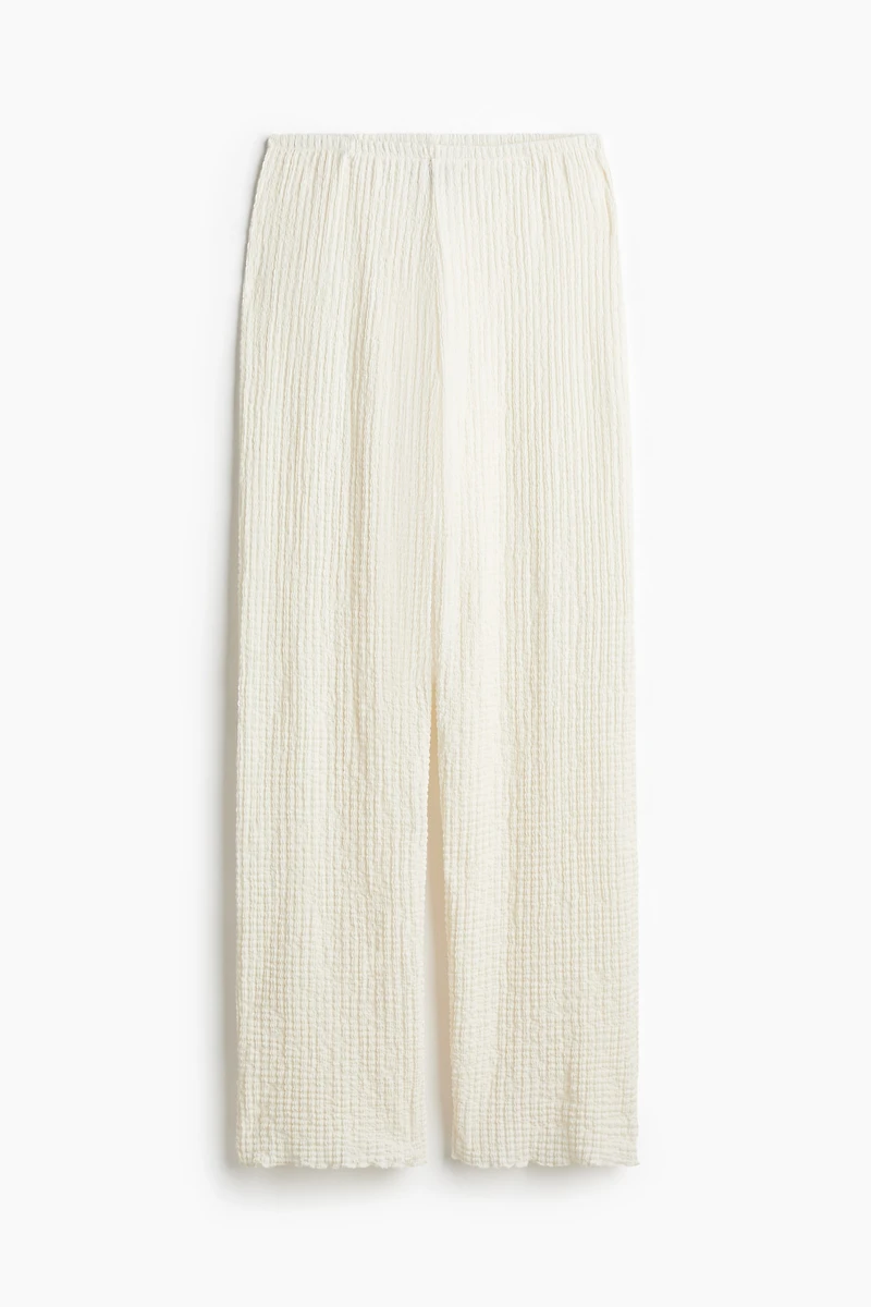 Pantalon en jersey froissé. Coupe flottante avec taille haute élastique et jambes larges, terminées par bord surjeté.
