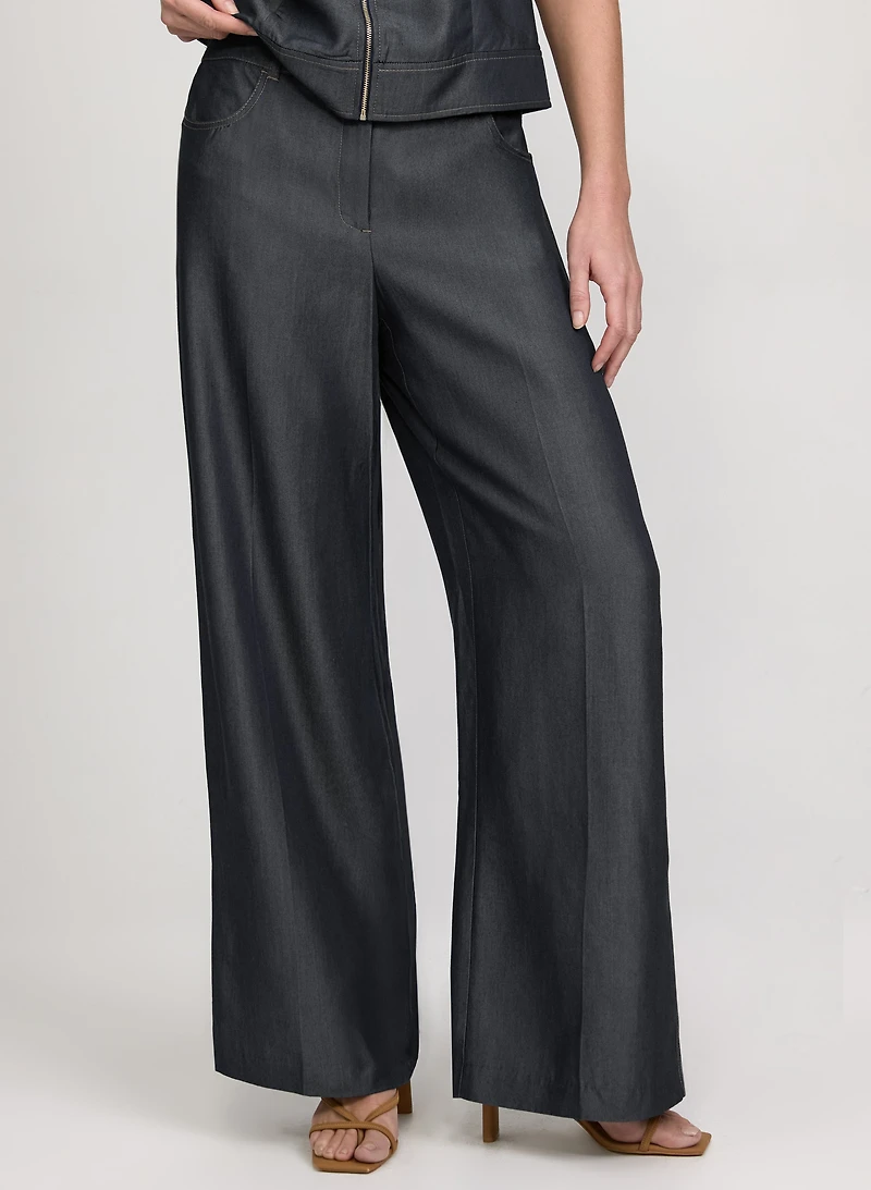 Notre pantalon soigné offre une coupe fluide et décontractée mais raffinée. Associez-le à un haut ajusté et à sa veste assortie de la collection pour équilibrer la silhouette.Coupe : Olivia Taille mi-hauteJambe large Passants de ceintureFermeture éclair Modèle à quatre poches Ceinture élastiqué au dos Matière en denim Tencel Entrejambe : 32 po