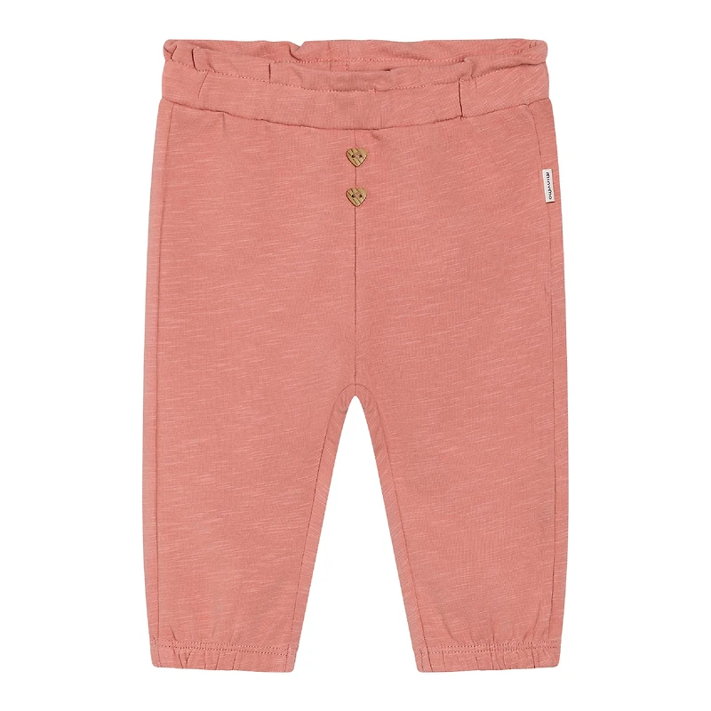 Pantalon de survêtement Minymo. Ce pantalon présente un imprimé chiné uni. Il est doté d'un élastique à la taille et aux chevilles. Deux boutons décoratifs ornent le devant. Fabriqué en coton biologique certifié. Certifié GOTS - biologique CERES-0366, certifié OEKO-TEX® STANDARD 100, n° de certificat 2276-364 DTI. Composition : 95 % coton / 5 % élasthanne.