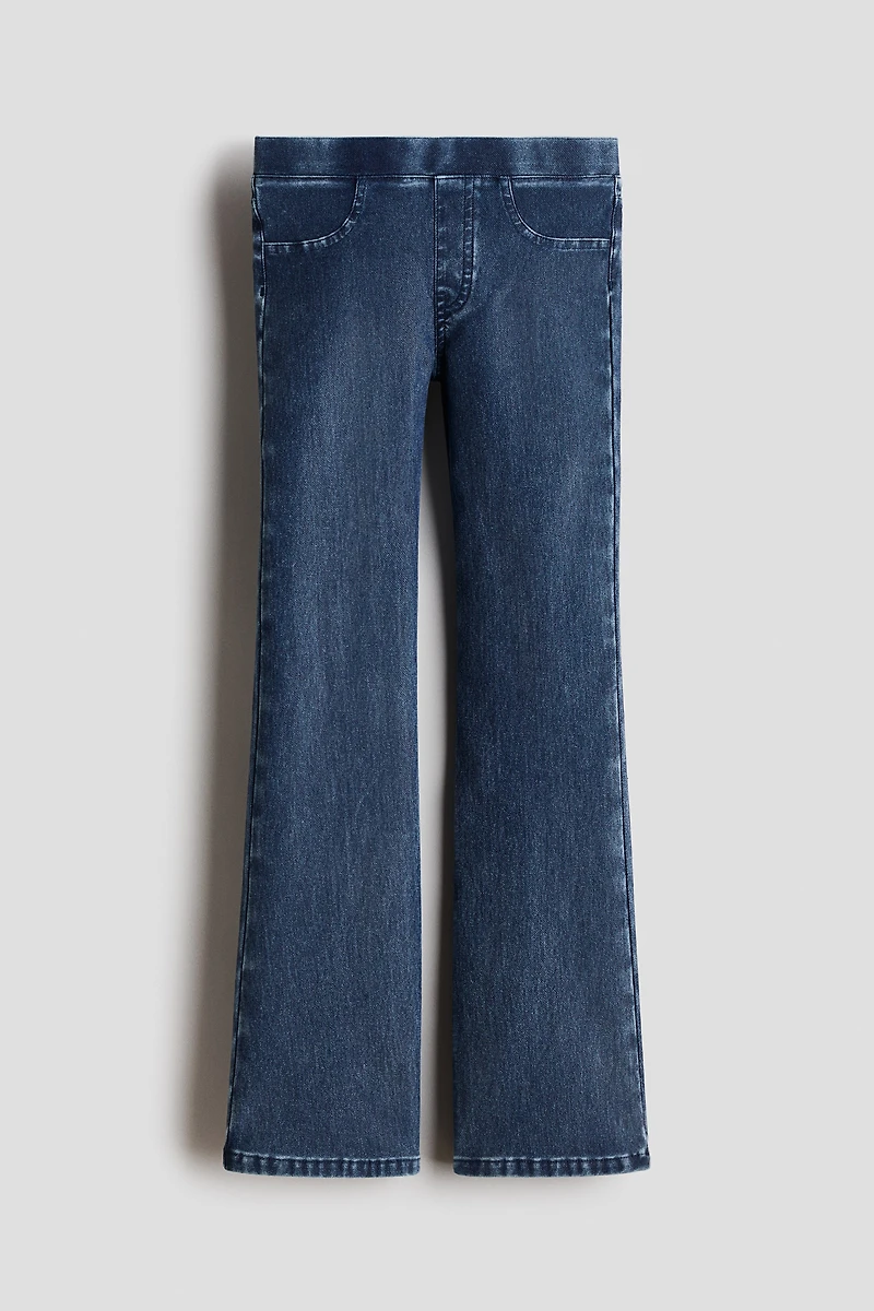 Pantalon souple en jersey épais d'aspect denim. Modèle à élastique à la taille et fausse braguette. Poches décoratives devant et vraies poches derrière. Jambes évasées.