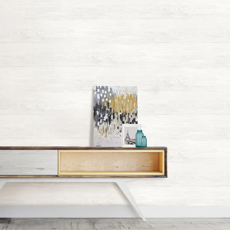 Papier peint inspiré des panneaux récupérés avec encre texturée en relief embellissant n'importe quel espace Endos autocollant facile à replacer et à enlever, et qui ne laisse aucun résidu collant Convient à toutes les surfaces lisses, plates, propres et peintes Rouleau de 20,5 po x 18 pi couvrant environ 30,75 pi²; Le motif se répète aux 20,5 po; Les planches mesurent 6,83 po de largeur