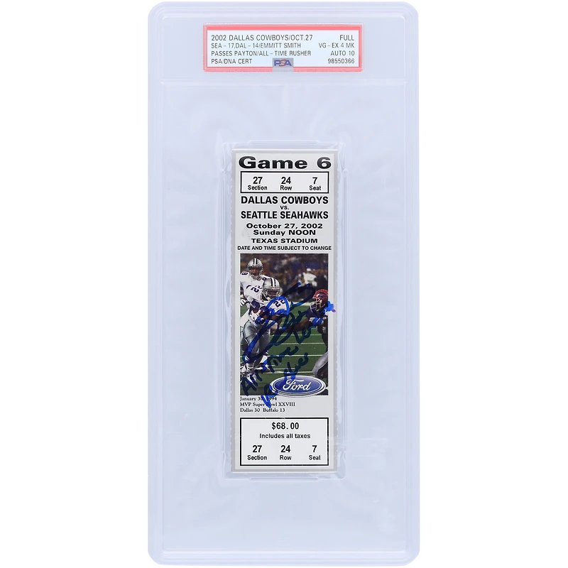 Passes autographiées d'Emmitt Smith Dallas Cowboys Walter Payton devient le meilleur rusher de tous les temps de la NFL Billet authentifié PSA 4/10 du 27 octobre 2002 avec l'inscription « All-Time Leading Rusher »Passes autographiées d'Emmitt Smith Dallas Cowboys Walter Payton devient le meilleur rusher de tous les temps de la NFL Billet authentifié PSA 4/10 du 27 octobre 2002 avec l'inscription « All-Time Leading Rusher »Passes autographiées d'Emmitt Smith Dallas Cowboys Walter Payton devient le meilleur rusher de tous les temps de la NFL Billet authentifié PSA 4/10 du 27 octobre 2002 avec l'inscription « All-Time Leading Rusher »