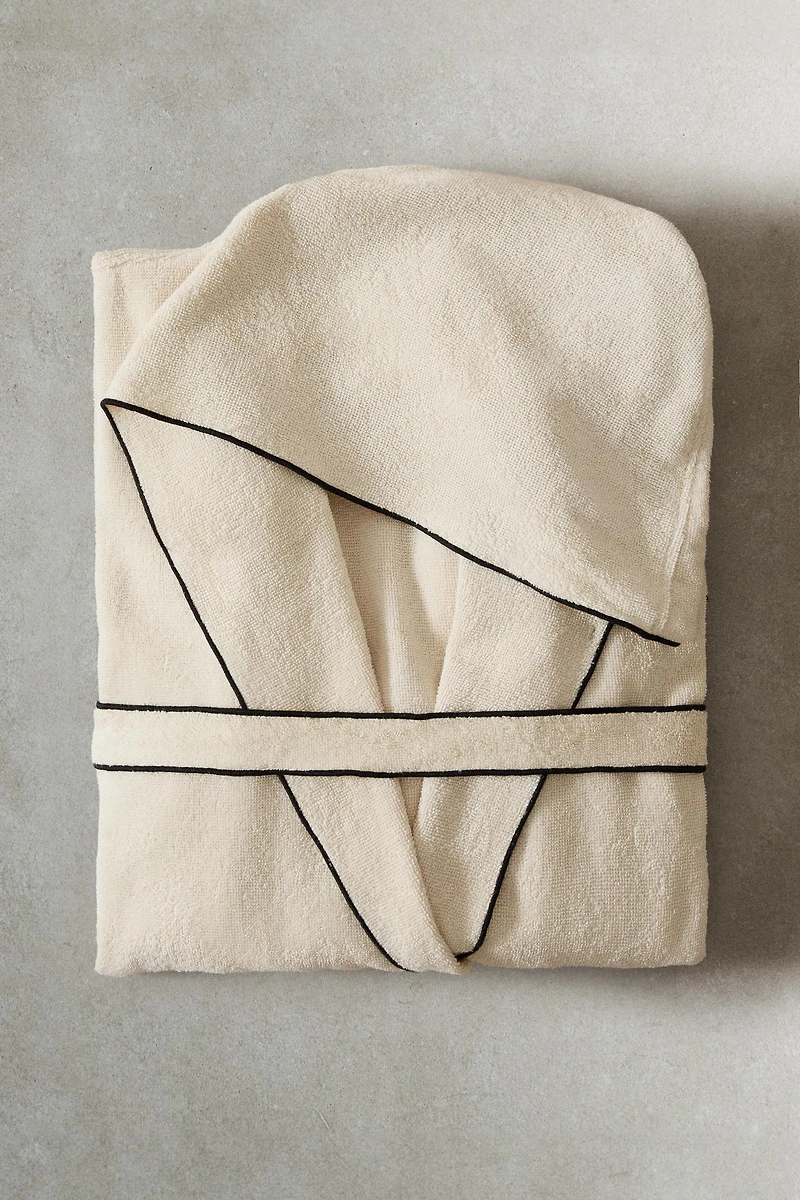 Peignoir à capuche en coton avec poches sur les côtés, ceinture et overlock contrastant sur le bord.