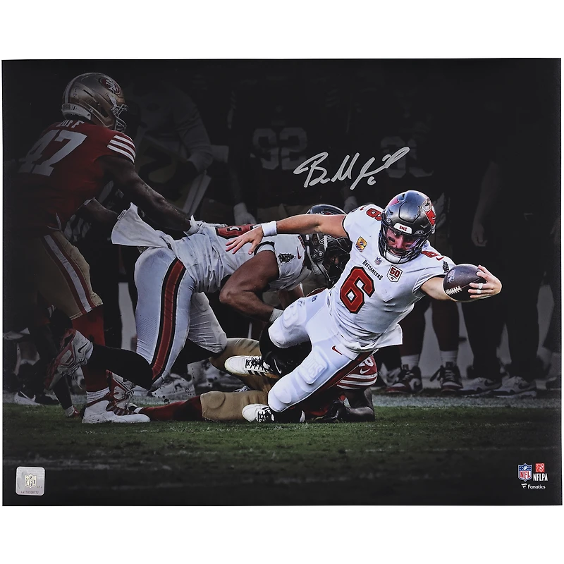 Photo dédicacée de Baker Mayfield (Buccaneers de Tampa Bay) - 40 x 50 cm (16 x 20 pouces) - s'étirant pour le premier essai.