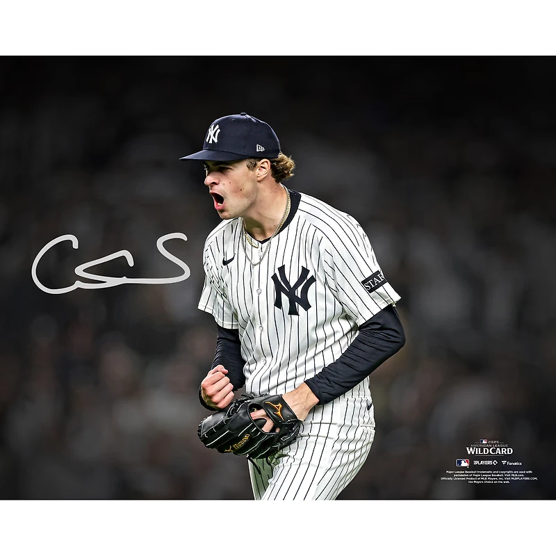 Photo dédicacée de Cam Schlittler (New York Yankees) - 40 x 50 cm - Célébration de son retrait sur trois prises lors de la série Wild Card de la Ligue américaine de la MLB 2025