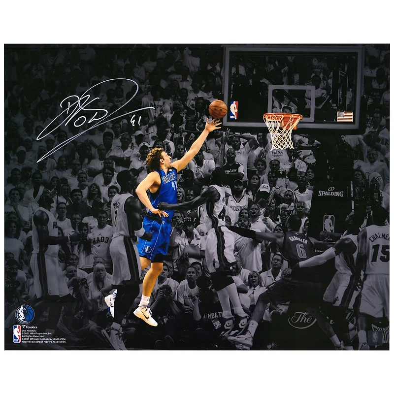 Photo dédicacée de Dirk Nowitzki (Dallas Mavericks) - Tir victorieux contre le Miami Heat (40,6 x 50,8 cm)